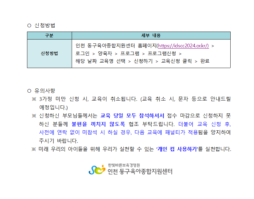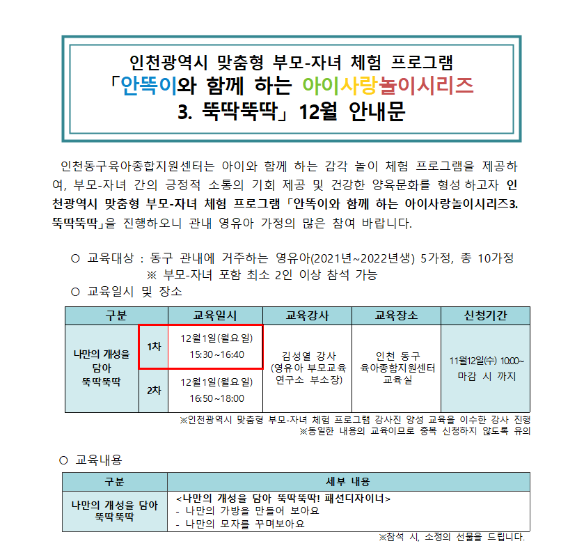 교육장소 인천 동구육아종합지원센터 3층 교육실 교육대상 관내 21~22년 영유아 5가정
