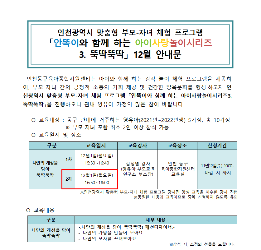 교육장소 인천 동구육아종합지원센터 3층 교육실 교육대상 관내 21~22년 영유아 5가정