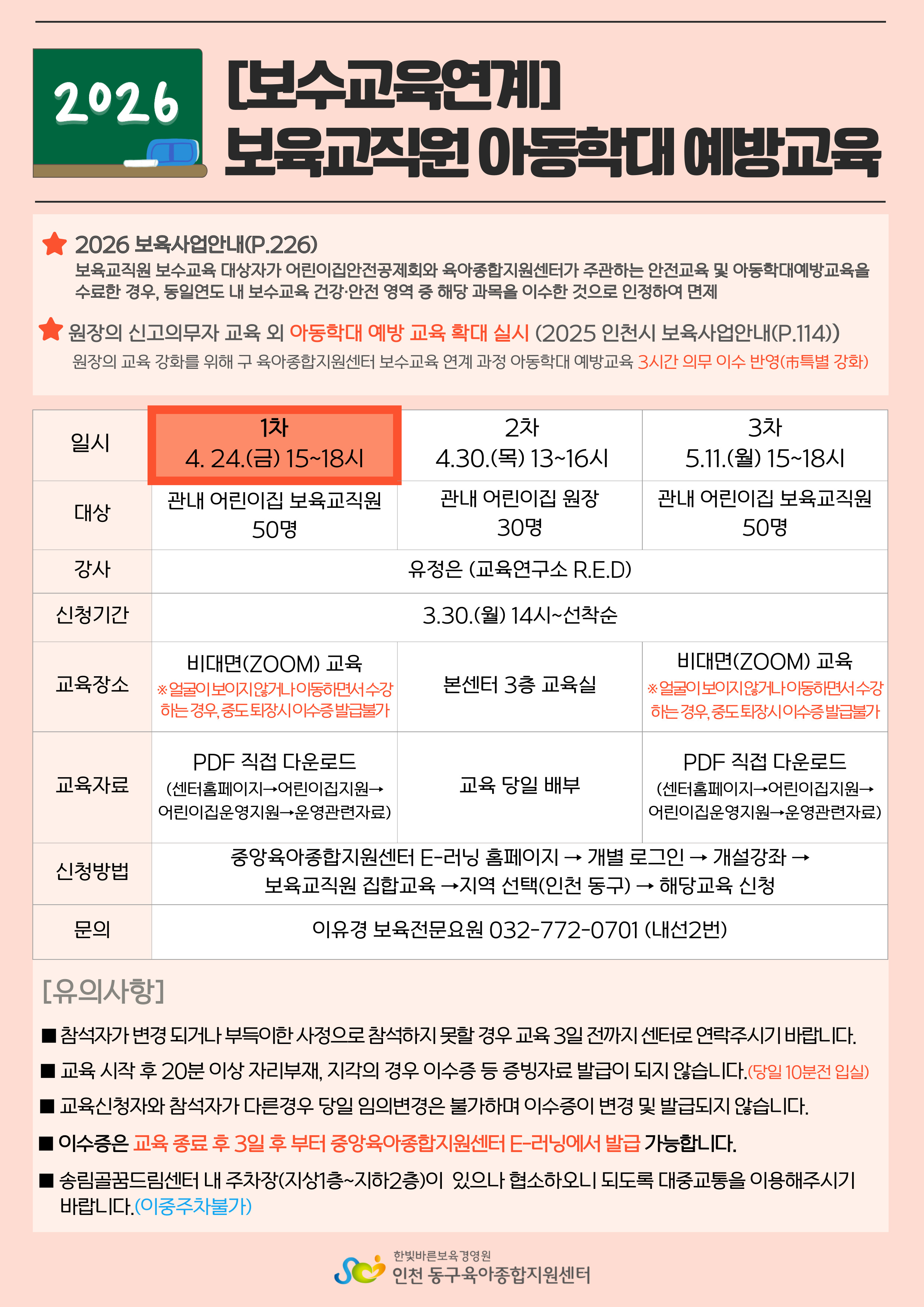 ★ 인천 시 아동학대예방 지침 강화에 따른 원장 의무 이수 교육(3H)